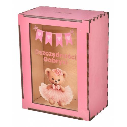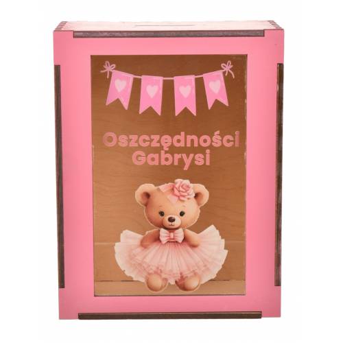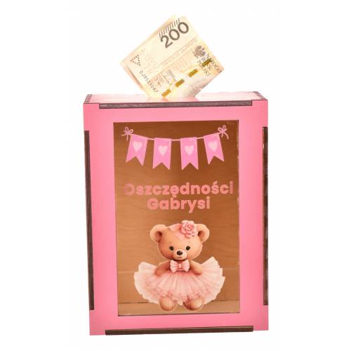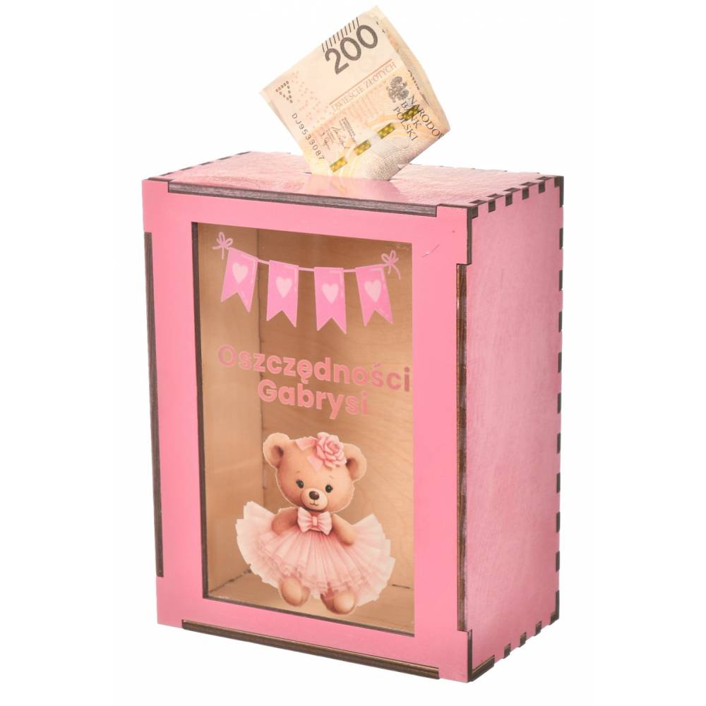 Skarbonka została wykonana z drewna i posiada przezroczyste okienko, które pozwala obserwować, jak rosną pierwsze oszczędności malucha. Idealnie sprawdzi się jako dekoracja pokoju dziecięcego oraz symboliczny prezent od rodziców, chrzestnych lub bliskich.