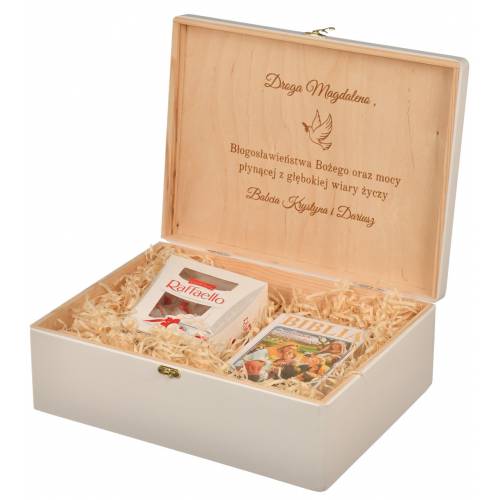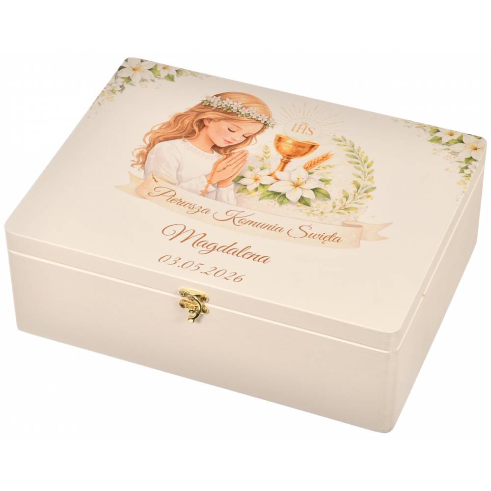 Eleganckie, białe drewniane pudełko na Komunię Świętą to wyjątkowa pamiątka, która po latach wciąż przywołuje najpiękniejsze wspomnienia. Po otwarciu ukazuje się personalizowany grawer z życzeniami i dedykacją, nadający mu indywidualny charakter.