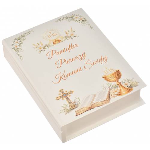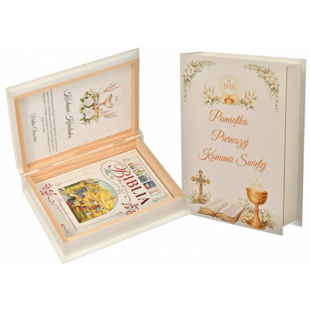 To gotowy zestaw komunijny: Biblia + drewniane pudełko z personalizacją, który nie wymaga dodatkowego pakowania. Kupujesz kompletny prezent, gotowy do wręczenia.
